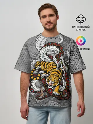 Мужская футболка оверсайз / Змея и Тигр|Tiger Snake Fight