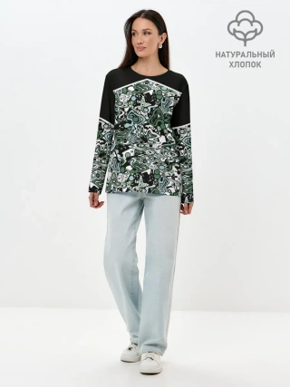 Лонгслив женский. Хлопок / Черно-зеленые каракули