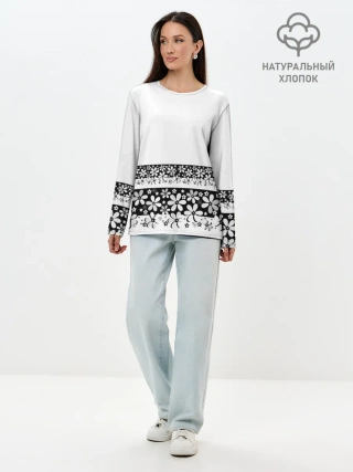 Лонгслив женский. Хлопок / Черно-белый цветочный принт