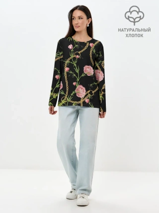 Лонгслив женский. Хлопок / Золотая цепь и розы