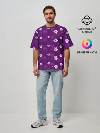 Мужская футболка оверсайз / узор цветы на фиолетовом фоне