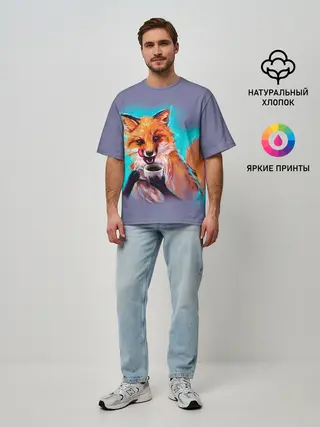 Мужская футболка оверсайз / Лиса с кофе