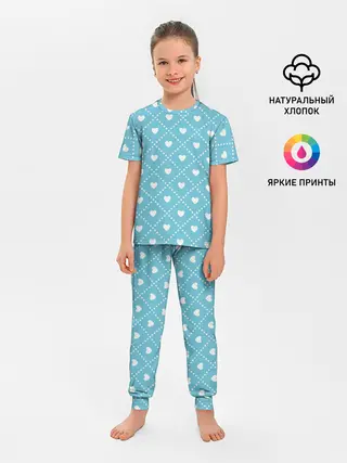 Детская пижама с брюками / Белые сердечки на голубом фоне