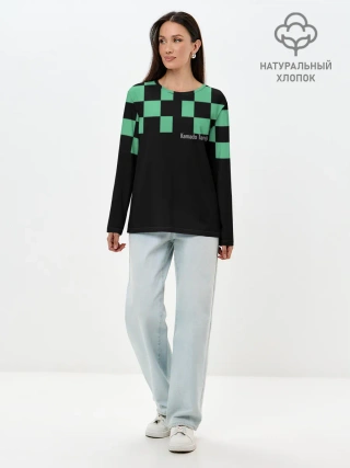 Лонгслив женский. Хлопок / Kamado Tanjiro зеленые квадраты