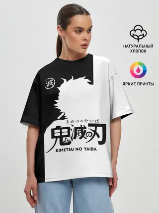 Женская футболка оверсайз / Черно белый силуэт Танджиро