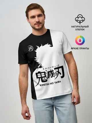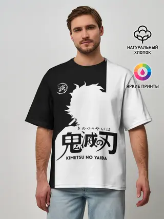 Мужская футболка оверсайз / Черно белый силуэт Танджиро