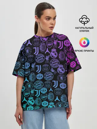 Женская футболка оверсайз / ЛОГО ФУТБОЛЬНЫХ КОМАНД НЕОН
