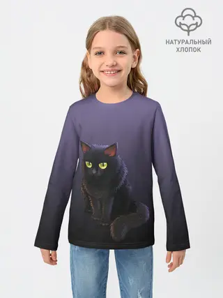 Детский лонгслив / черный кот на фиолетовом