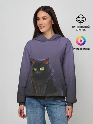 Женское худи / черный кот на фиолетовом