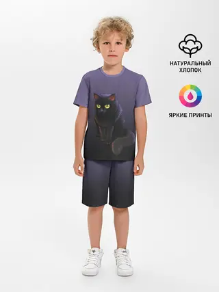 Детская пижама с шортами / черный кот на фиолетовом