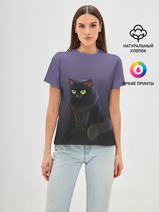 Женская базовая футболка / черный кот на фиолетовом
