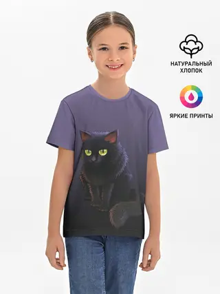 Детская базовая футболка / черный кот на фиолетовом