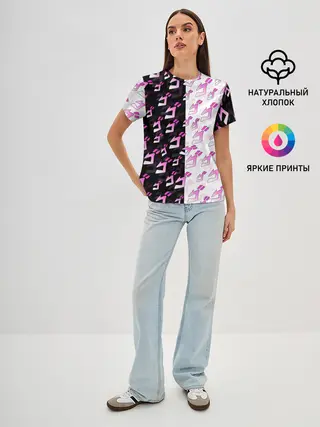 Женская базовая футболка / Розовые джоджо на чернобелом