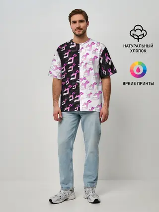 Мужская футболка оверсайз / Розовые джоджо на чернобелом