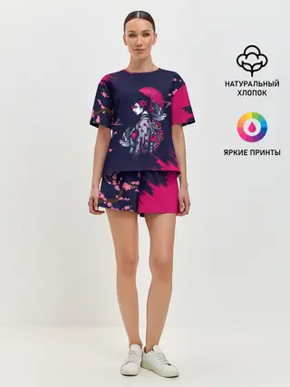 Женская пижама с шортами / ДЕВУШКА В КИМОНО И ПТИЦАМИ