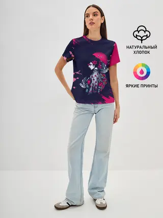 Женская базовая футболка / ДЕВУШКА В КИМОНО И ПТИЦАМИ