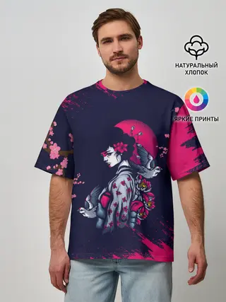 Мужская футболка оверсайз / ДЕВУШКА В КИМОНО И ПТИЦАМИ
