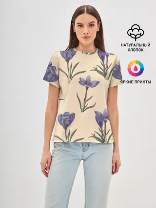 Женская базовая футболка / Цветы шафрана на бежевом фоне