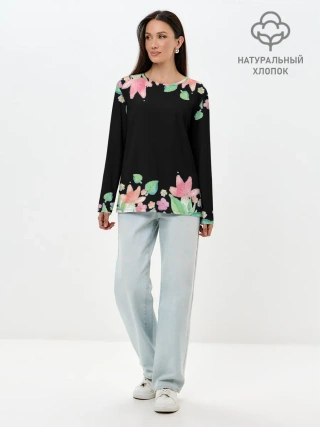 Лонгслив женский. Хлопок / Рамка из розовых и зеленых листьев
