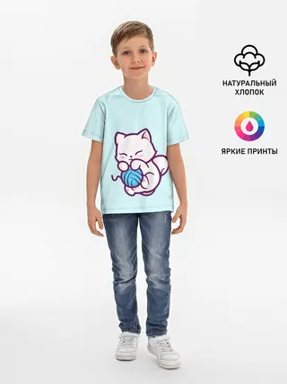 Детская базовая футболка / Белый котенок с клубком милый
