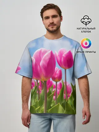 Мужская футболка оверсайз / Розовые тюльпаны