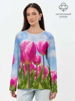 Лонгслив женский. Хлопок / Розовые тюльпаны