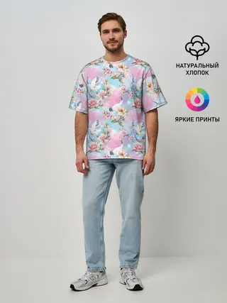 Мужская футболка оверсайз / Узор с журавлями