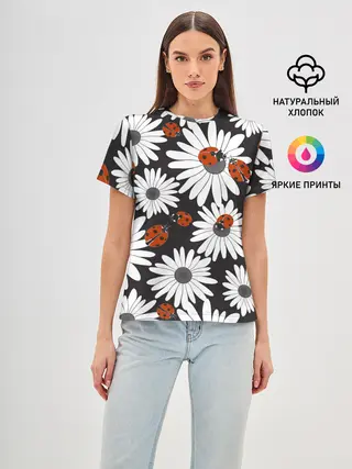 Женская футболка оверсайз / Божьи коровки на ромашках