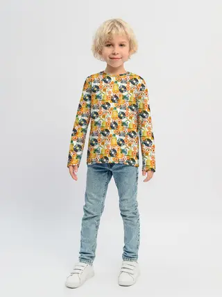 Актуальный дизайн, плотная ткань, сели отлично, хорошее качество На 122-128 взяли 134, ребёнок крепкий, но не полный. Крутой принт