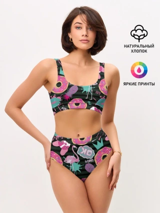 Женские топ и трусы / Пончики, мопсы и фламинго.