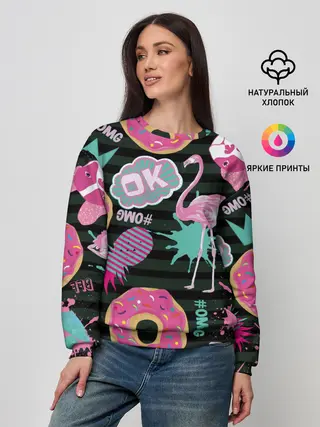 Женский свитшот / Пончики, мопсы и фламинго.