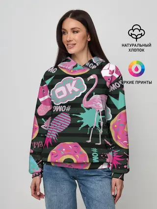 Женское худи / Пончики, мопсы и фламинго.