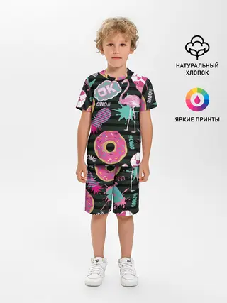 Детская пижама с шортами / Пончики, мопсы и фламинго.