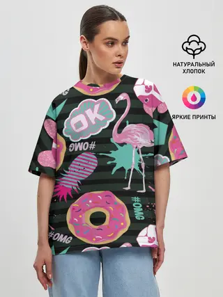 Женская футболка оверсайз / Пончики, мопсы и фламинго.