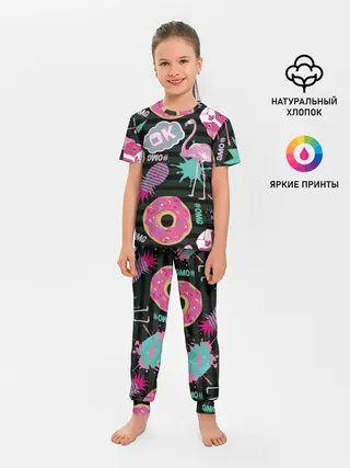 Детская пижама с брюками / Пончики, мопсы и фламинго.