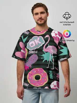Мужская футболка оверсайз / Пончики, мопсы и фламинго.