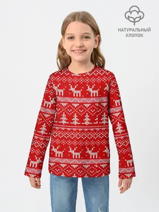 Детский лонгслив / Новогодний узор с оленями и елкой