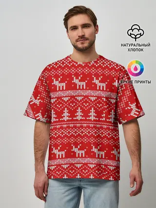 Мужская футболка оверсайз / Новогодний узор с оленями и елкой