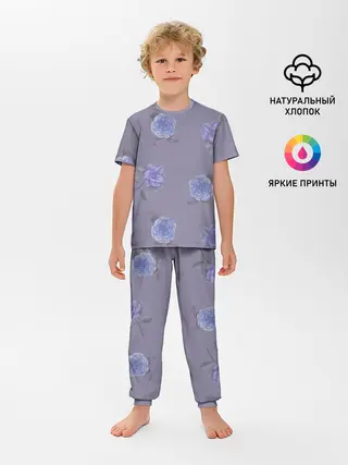 Детская пижама с брюками / Голубые камелии на сером