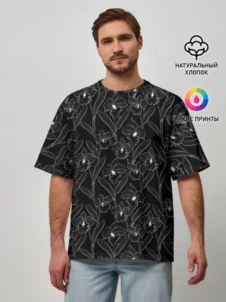 Мужская футболка оверсайз / Цветы орхидеи на черном