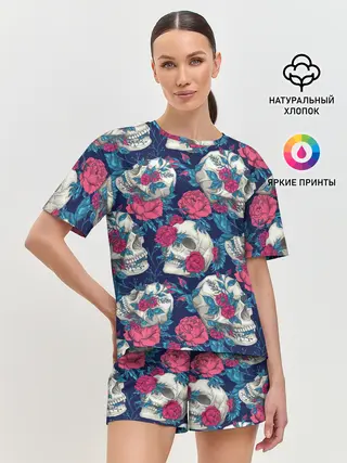 Женская пижама с шортами / Реалистичные черепа с розами