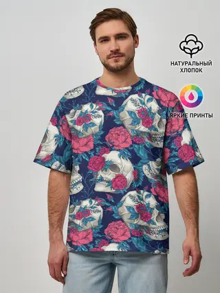 Мужская футболка оверсайз / Реалистичные черепа с розами