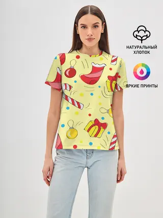 Женская базовая футболка / Новогодний узор на желтом фоне