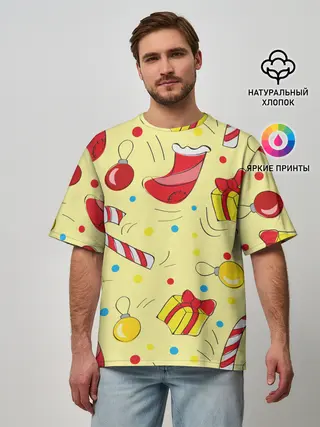 Мужская футболка оверсайз / Новогодний узор на желтом фоне