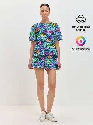 Женская пижама с шортами / Неоновый яркий абстрактный узо