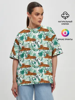 Женская футболка оверсайз / Цветы и Тигр Паттерн