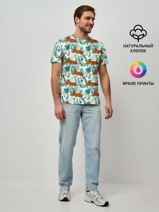 Мужская базовая футболка / Цветы и Тигр Паттерн