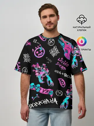 Хорошая качественная футболка. Принт чёткий. Состав указан на бирке. Маломерит либо сидеть будет в обтяжку. Очень плотная, прям тёплая. Ехала вечность!