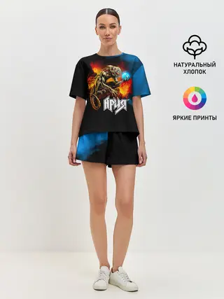Хорошая качественная футболка. Принт чёткий. Состав указан на бирке. Маломерит либо сидеть будет в обтяжку. Очень плотная, прям тёплая. Ехала вечность!