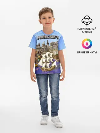 Детская базовая футболка / Корабль и замок в манкрафт.